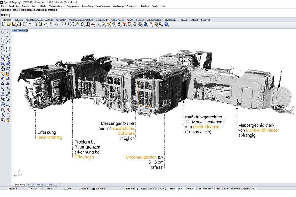 Im bisherigen Projektverlauf erfolgten Aufmaßtests einzelner Räume und zusammenhängender Raumgruppen mit der HoloLens. Die erfassten Daten konnten in weiteren Schritten als dreidimensionale Informationen mit marktüblichen CAD-Programmen geöffnet und bearbeitet werden. Ein aus verknüpften Mesh-Flächen zusammengesetztes Polygonnetz bildet dabei die aufgenommene Raumgeometrie ab. Die Auswertung dieser Daten sowie der Abgleich mit händisch ermittelten Messwerten ergab Abweichungen von zirka 3%. Zudem weist die erfasste Netzstruktur Lücken als auch Unebenheiten, welche höchstwahrscheinlich auf unregelmäßige Lichtverhältnisse zurückzuführen sind, auf. Derzeit wird die Generierung eines rechteckigen Raumes ohne Öffnungen aus erfassten Geometrien mit Hilfe grafischer Programmierungssoftware (Rhinoceros 3D, Grasshopper, Fologram) erarbeitet. Ebenso konnte der konzeptionelle Aufbau der erzielten Applikation abgeschlossen werden.