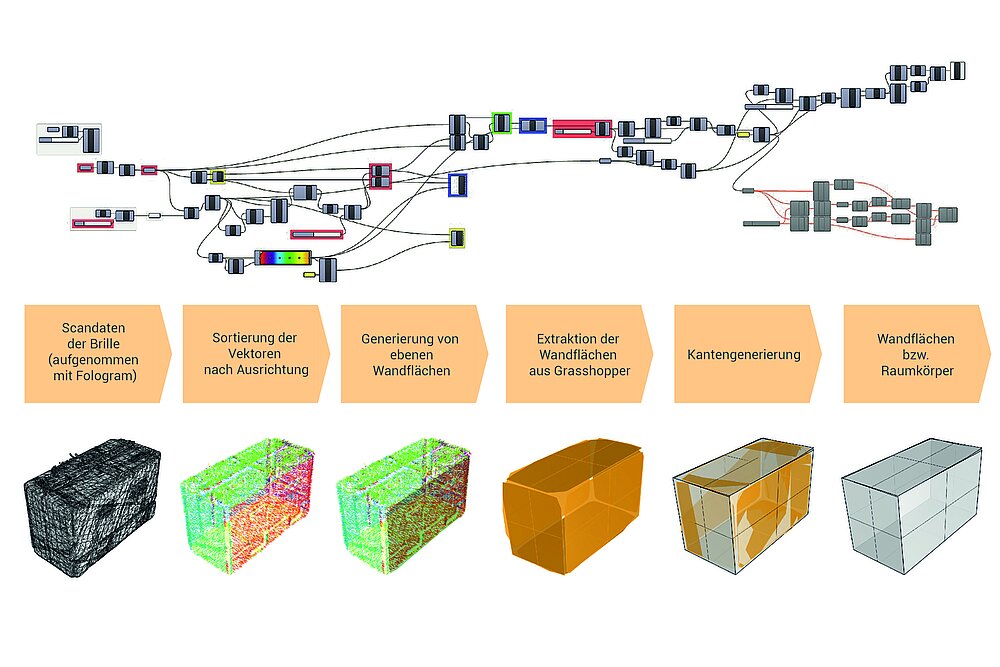 Perspektivisch sind im Forschungsprojekt weitere Aufmaßtests und Abgleiche mit Messdaten von 3D-Laserscannern und händischen Messverfahren vorgesehen. Ziel ist es, den Umgang mit messprinzipbedingten Abweichungen bzw. Ungenauigkeiten zu optimieren. Als nächster Schritt wird eine klare Identifizierung von Raumkanten vorbereitet. Nach Abschluss einer vollständigen Raumgenerierung mittels grafischer Programmierung folgt die Erstellung eines Interfaces für die konzeptionierte Applikation sowie die Verknüpfung derer mit den erarbeiteten Algorithmen. Am Ende der Arbeit ist in Zusammenarbeit verschiedener Planungsbüros die prototypische Implementierung des Programms unter realen Bedingungen vorgesehen.