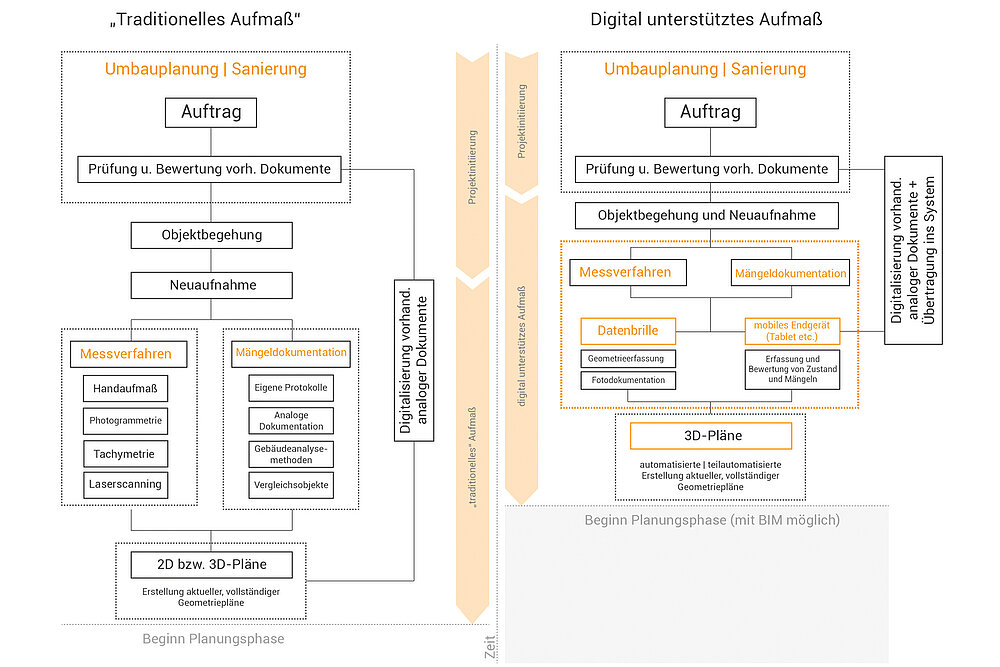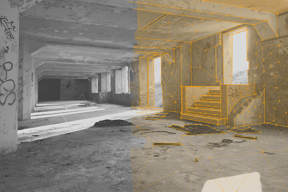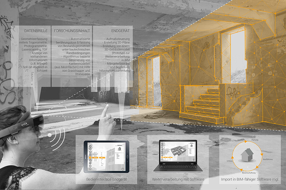 Die gezielte Verwendung digitaler Werkzeuge, die schnell kontextbezogene verlässliche Informationen liefern, könnte die Einschätzung der Potenziale bestehender baulicher Strukturen in den in Bezug auf Kosten- und Ressourcenverbrauch entscheidenden frühen Entwurfsphasen präzisieren. Die geometrische Raumerfassung erfolgt gegenwärtig überwiegend händisch mit Distanzmesser, Tachymeter oder Laserscanner. Die erfassten Daten werden anschließend meist im Büro ausgewertet und weiterverarbeitet. Die Auswertung und der Abgleich zwischen Bausubstanz und Planung ist somit momentan vor Ort, d.h. auf der Baustelle, kaum möglich. Der Einsatz moderner digitaler Technologien, insbesondere die Verwendung von Augmented und Virtual Reality, könnte hier die Lösung darstellen.