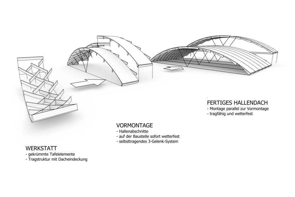 Als Lösungsansatz wurde eine segmentierte, kreisbogenförmige Brettrippendachkonstruktion entwickelt, bei der die Herstellung der Dachsegmente weitgehend in die Werkhalle verlagert wurde. Unter Werkstattbedingungen wurden stapel- und transportierbare Bogendachsegmente gefertigt, die auf der Baustelle zu Bogendachabschnitten komplettiert und per Kranmontage auf Stützen oder Wänden versetzt werden konnten. Hierzu wurde eine Parametrik zur Beschreibung der Lamellen- und Segmentgeometrie in Abhängigkeit von Grundfläche, Systemraster und Bogenstich erarbeitet und in Parameterstudien hinsichtlich Tragverhalten, Fertigungsaufwand und Montageökonomie untersucht. Ein zentrales Forschungsthema bildete die Einbindung der Dachschalung als mittragendes Element insbesondere im Bauzustand. Dazu wurden Großversuche zu Verbindungsarten und Tragverhalten durchgeführt.