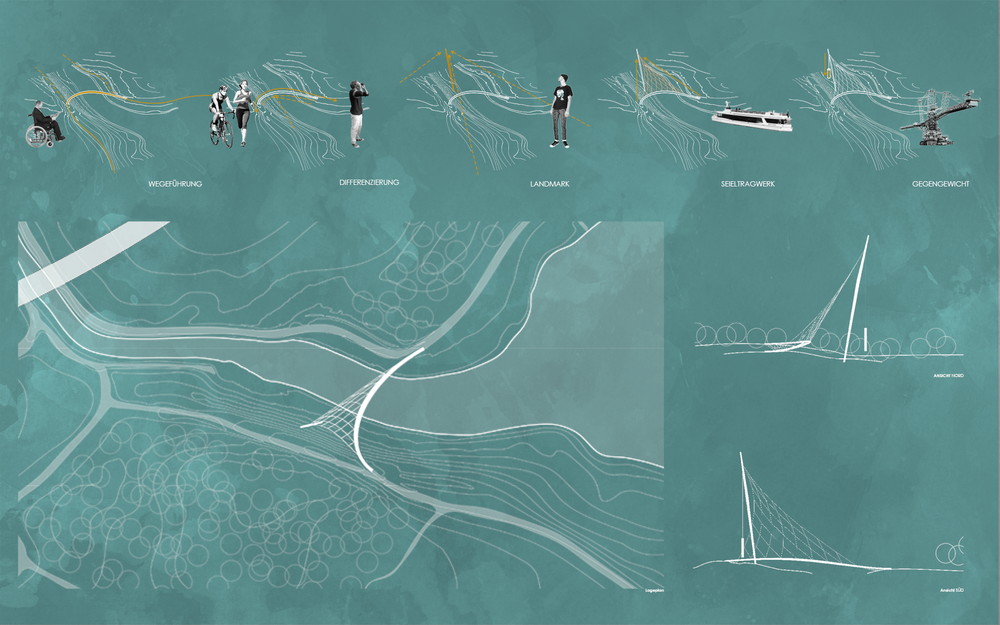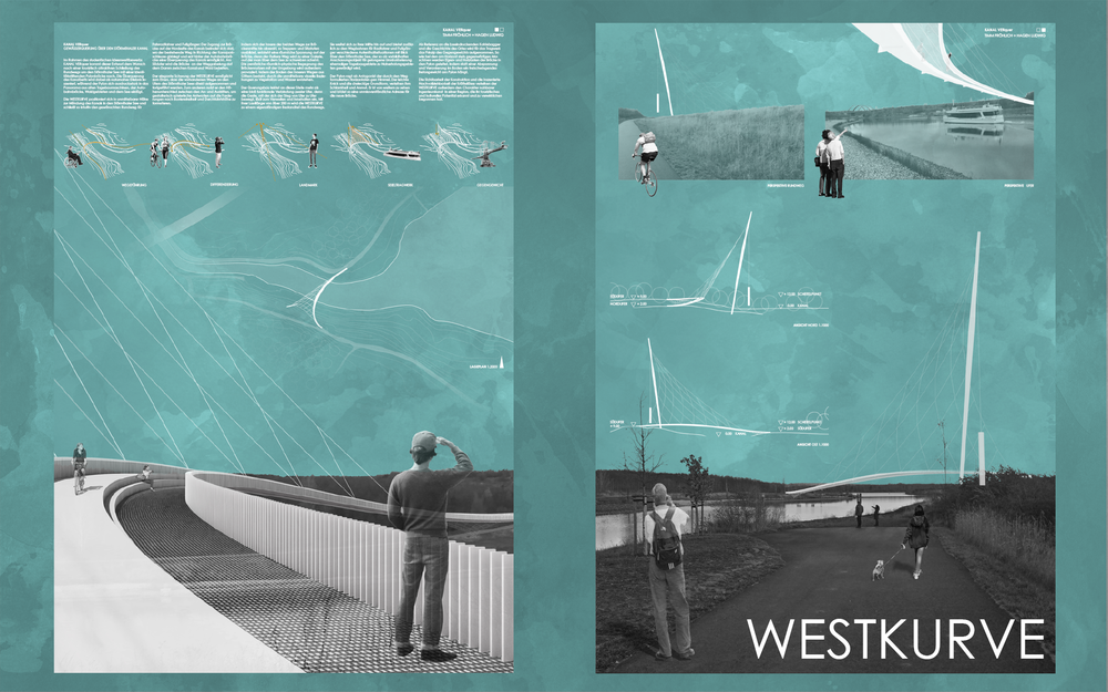 Im Rahmen des studentischen Ideenwettbewerbs KANAL VERquer kommt dieser Entwurf dem Wunsch nach einer touristisch attraktiven Schließung des Rundwegs um den Störmthaler See mit einer identitätsstiftenden Pylonbrücke nach. Die Überquerung des Kanalbetts wird dabei als naturnahes Erlebnis inszeniert, während der Pylon sich ausdrucksstark in das Panorama aus alten Tagebaumaschinen, der Autobahnbrücke, Waldgebieten und dem See einfügt. Die WESTKURVE positioniert sich in unmittelbarer Nähe zur Mündung des Kanals in den Störmthaler See und schließt so intuitiv den gewünschten Rundweg für Fahrradfahrer und Fußgänger: Der Zugang zur Brücke auf der Nordseite des Kanals befindet sich dort, wo der bestehede Weg in Richtung der Kanuparkschleuse abbiegt und erst hinter der Autobahnbrücke eine Überquerung des Kanals ermöglicht. Am Südufer wird die Brücke an der Weggabelung auf dem Damm zwischen Kanal und Wald betreten. Der elegante Schwung der WESTKURVE ermöglicht zum Einen, dass die vorhandenen Wege an den Ufern des Störmthaler Sees direkt aufgenommen und fortgeführt werden. Zum anderen nutzt er den Höhenunterschied zwischen den An- und Austritten, um gestalterisch spielerische Antworten auf die Forderungen nach Barrierefreiheit und Durchfahrtshöhe zu formulieren. Indem sich der innere der beiden Wege zur Brückenmitte hin absenkt, so Treppen- und Sitzstufen ausbildet, entsteht eine räumliche Spannung auf der Brücke, denn der äußere Weg wird zu einer Galerie, auf der man über dem See zu schweben scheint. Die persönliche räumlich-physische Begegnung des Brückennutzers mit der Umgebung wird außerdem provoziert, indem der Boden des inneren Weges aus Gittern besteht, durch die unmittelbare visuelle Beziehungen zu Vegetation und Wasser entstehen. Der Querungsbau leistet an dieser Stelle mehr als eine bloß funktionale Verbindung zweier Ufer, denn die Geste, mit der sich der Steg von Ufer zu Ufer bewegt, lädt zum Verweilen und Innehalten ein. Mit ihrer Lauflänge von über 200 m wird die WESTKURVE zu einem eigenständigen Bestandteil des Rundwegs. Sie weitet sich zu ihrer Mitte hin auf und bietet zusätzlich zu den Wegbahnen für Radfahrer und Fußgänger verschiedene Aufenthaltssituationen mit Blick über den Störmthaler See, der so als vorbildhaftes Anschauungsobjekt für gelungene Umstrukturierung ehemaliger Tagebaugebiete zu Naherh lungsgebieten gewürdigt wird. Der Pylon ragt als Antagonist der durch den Weg formulierten Horizantalen gen Himmel. Der leichte Knick und die dreieckige Grundform, verleihen ihm Schlankheit und Anmut. Er ist von weitem zu sehen und bildet so eine unmissverständliche Adresse für die neue Brücke. Als Referenz an die beeindruckenden Kohlebagger und die Geschichte des Ortes wird für das Tragwerk das Prinzip des Gegengewichts aufgenommen. So wie bei den am Horizont stets gegenwärtigen Maschinen werden Eigen- und Nutzlasten der Brücke in den Pylon geleitet, indem statt einer Abspannung und Verankerung im Boden ein freischwingendes Betongewicht am Pylon hängt. Die Sichtbarkeit der Konstruktion und die inszenierte Nachvollziehbarkeit der Kräfteflüsse verleihen der WESTKURVE außerdem den Charakter nahbarer Ingeneurskunst in einer Region, die ihr touristisches und kulturelles Potential erkannt und zu verwirklichen begonnen hat.