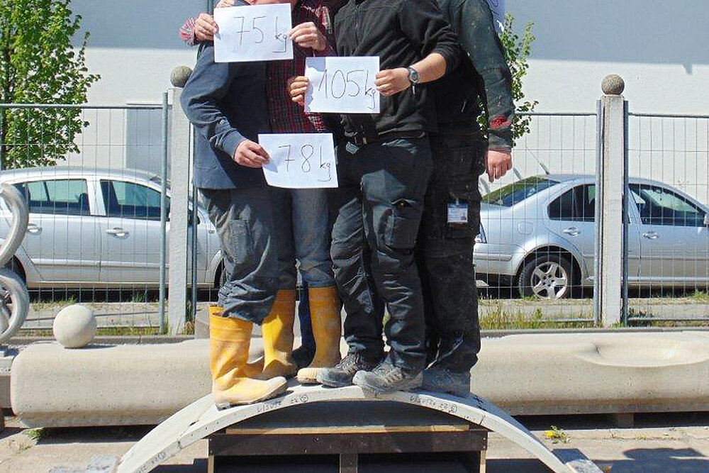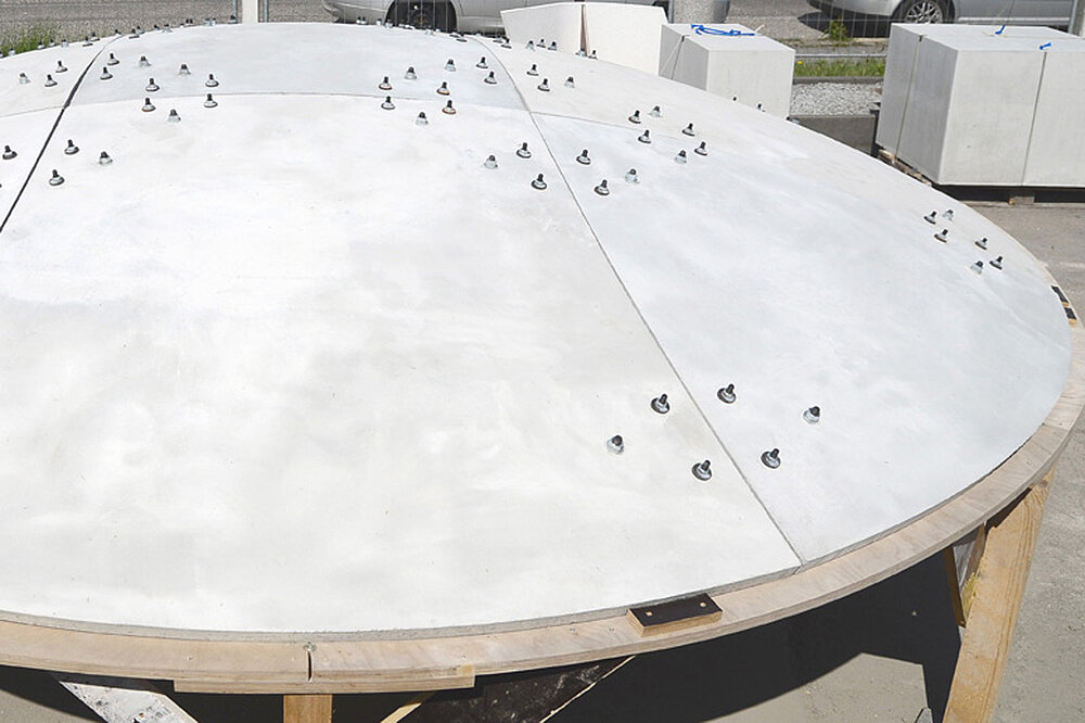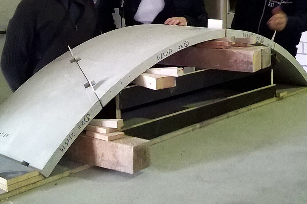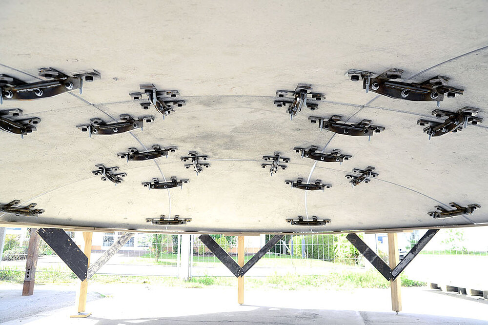 Die entwickelte Strategie wurde nach Abschluss aller Optimierungsprozesse an einem Demonstrator erprobt. Der Prototyp wurde aus einer Kugelkalottegeometrie mit einem Durchmesser von 4,50 Meter und einer Pfeilhöhe von nur 60 cm entwickelt. Die vorgefertigten faserbewehrten Segmente hatten dabei eine Dicke von lediglich 45 mm! So konnte praktisch bestätigt werden, dass die im Forschungsprojekt entwickelte Vorgehensweise eine baupraktisch anwendbare Lösung ist, um Tragwerke aus Freiformschalen ressourcenschonend, wirtschaftlich und gemäß moderner Nutzeranforderungen bauen zu können.