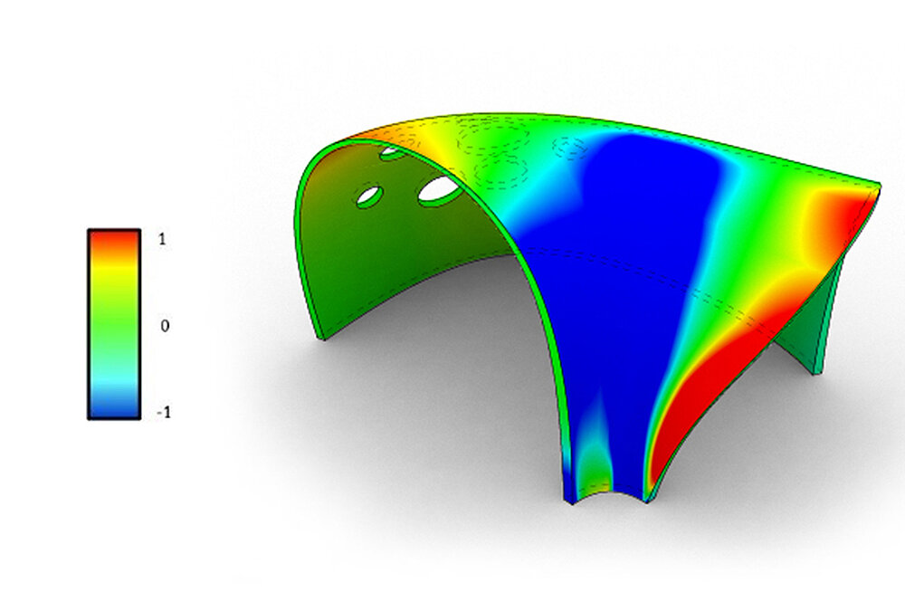 Um den gesellschaftlichen Forderungen nach Ressourcenschonung und Nachhaltigkeit auch in der Architektur gerecht zu werden, müssen bautechnische Lösungen zur Reduktion des Betonverbrauchs gefunden werden. Eine Möglichkeit ist die Herstellung materialeffizienterer Strukturen. Beanspruchungsaffin gekrümmte Schalentragwerke ermöglichen aufgrund ihrer hocheffizienten, räumlichen Tragwirkung bzw. Lastabtragung einen deutlich niedrigeren Materialverbrauch als „konventionell-orthogonale“ Konstruktionen und beinhalten so einen nachhaltigen Lösungsansatz für das Bauen mit Beton.