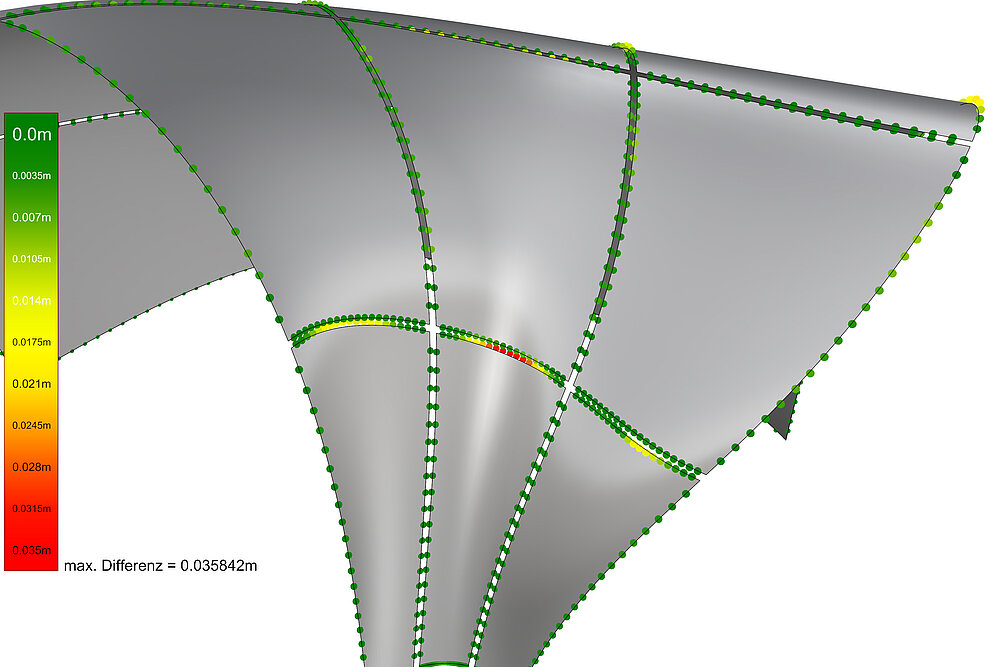 Auf diese Weise entsteht durch die im Forschungsprojekt entwickelte Methodik ein teilautomatisches, parametrisches, auf jede Schalengeometrie übertragbares Modell, das Informationen zu Fertigungs-, Konstruktions- und Tragwerksdaten sowie Montagesimulationen liefert.