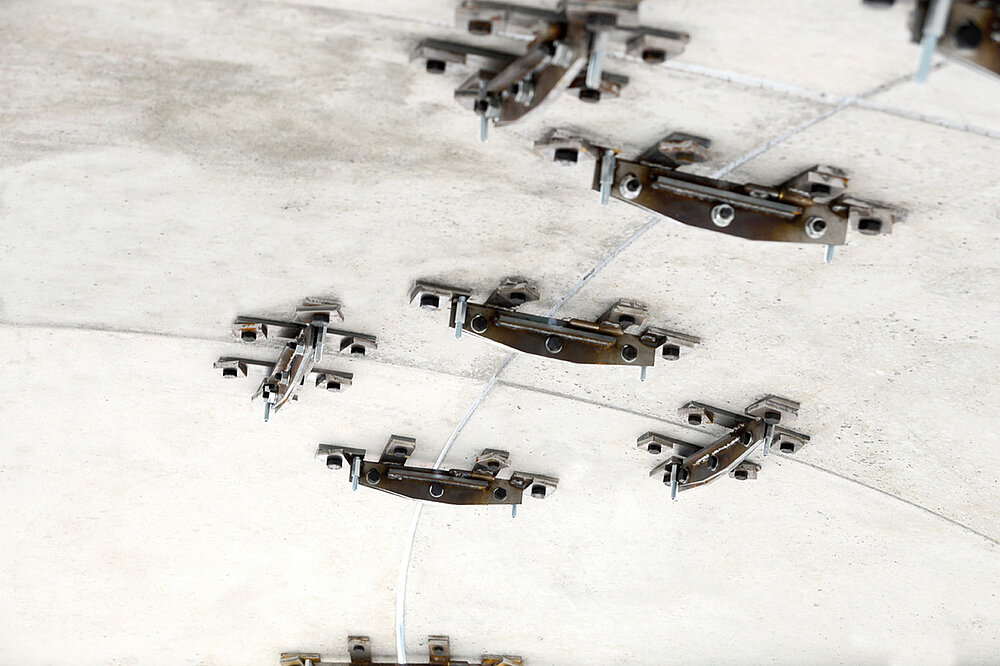 Zur Fügung der dünnwandigen Halbfertigteile wurde vom Projektpartner Köber-Plan ein adaptives Verbindungselement aus Stahl entworfen. Dieser sogenannte Doppelkreuzverbinder (kurz: DKV) wird luftseitig an einbetonierten Hülsen in den Segmenten der Primärschale verschraubt. Dort verbleibt er bis zum Aushärten der Aufbetonschicht, kann dann abgenommen und schließlich wiederverwendet werden.
