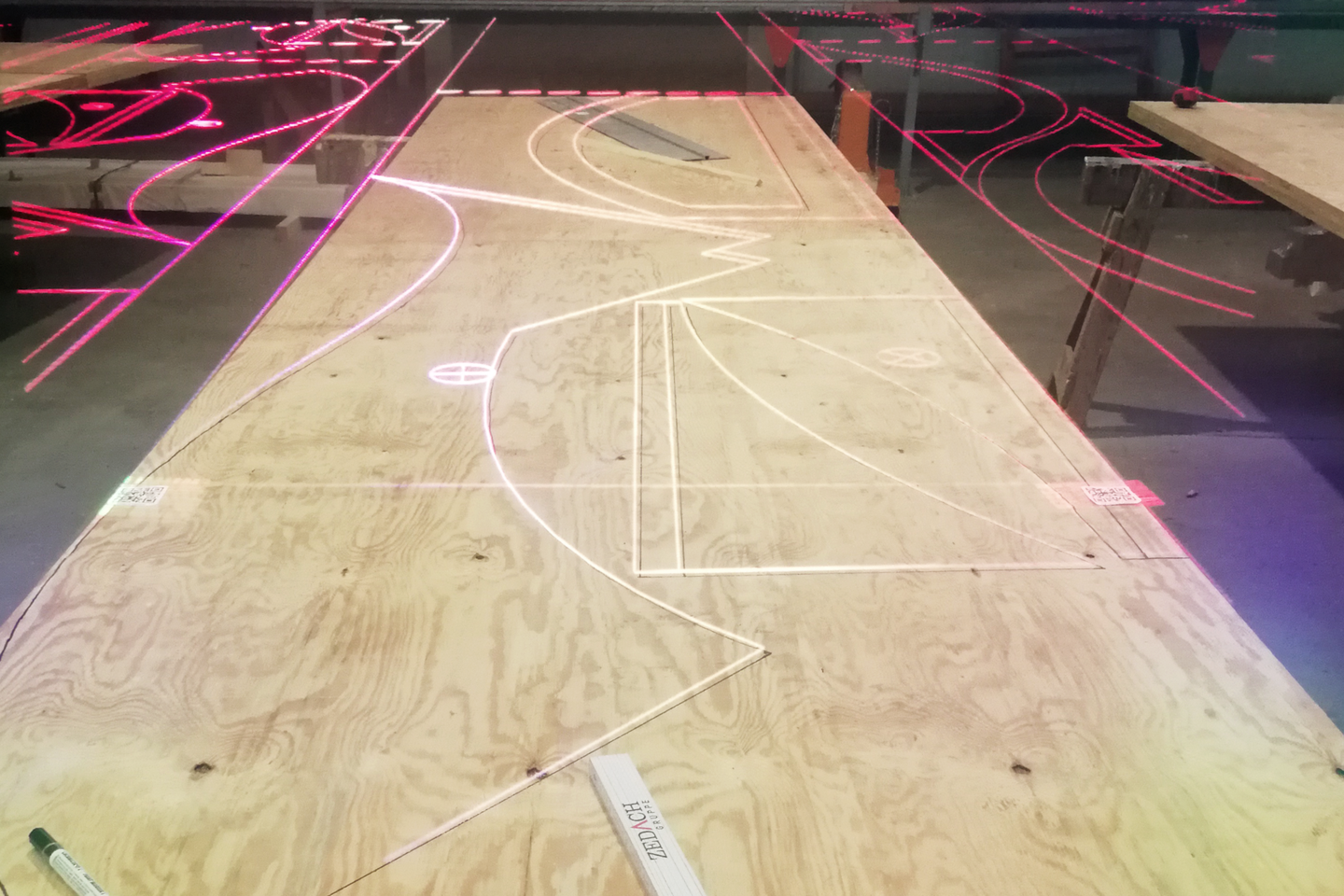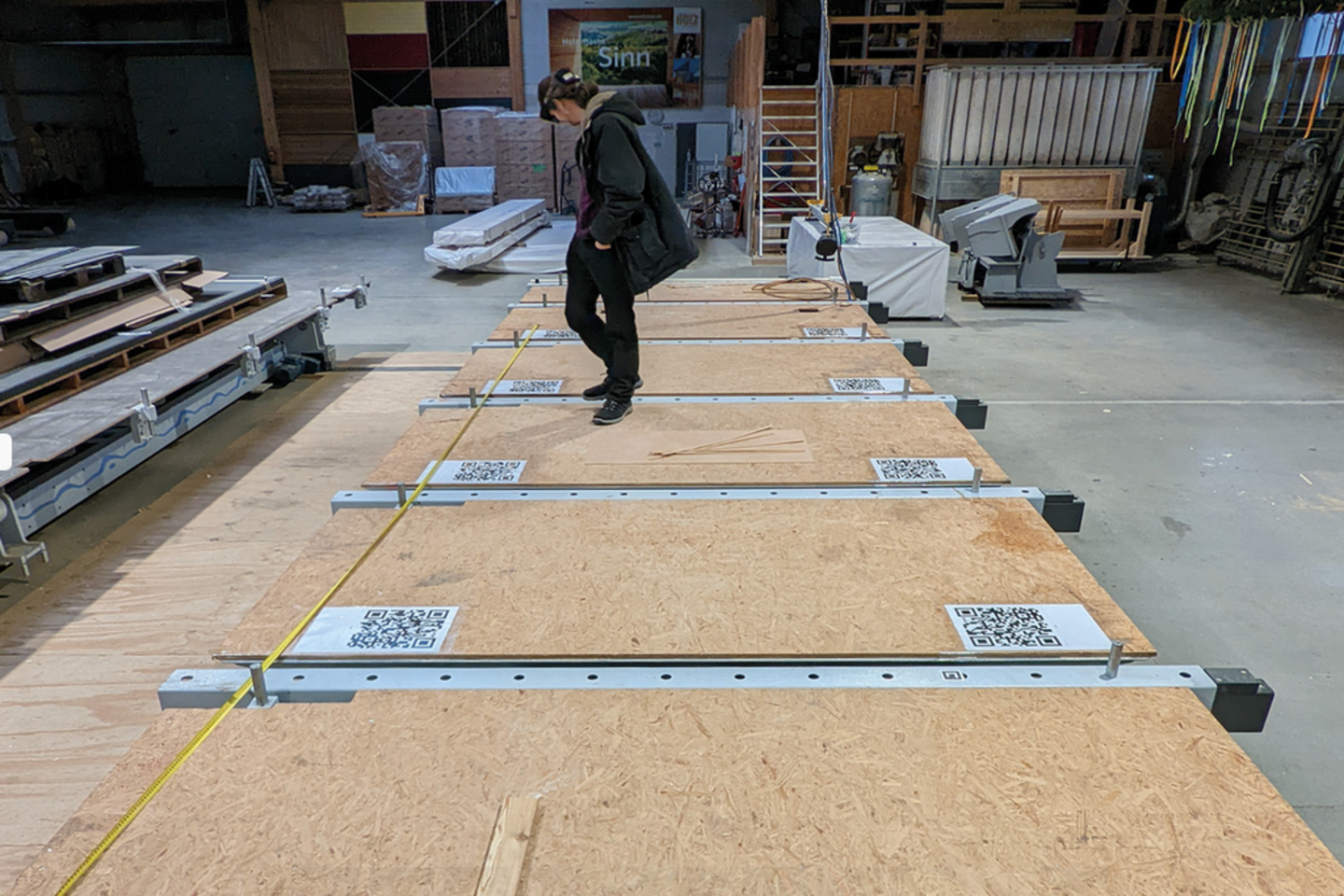 Test field equipped with localisation markers on the donor table of the Holzbau Lepski workshop, © FLEX @ HTWK Leipzig, Felix Schmidt-Kleespies