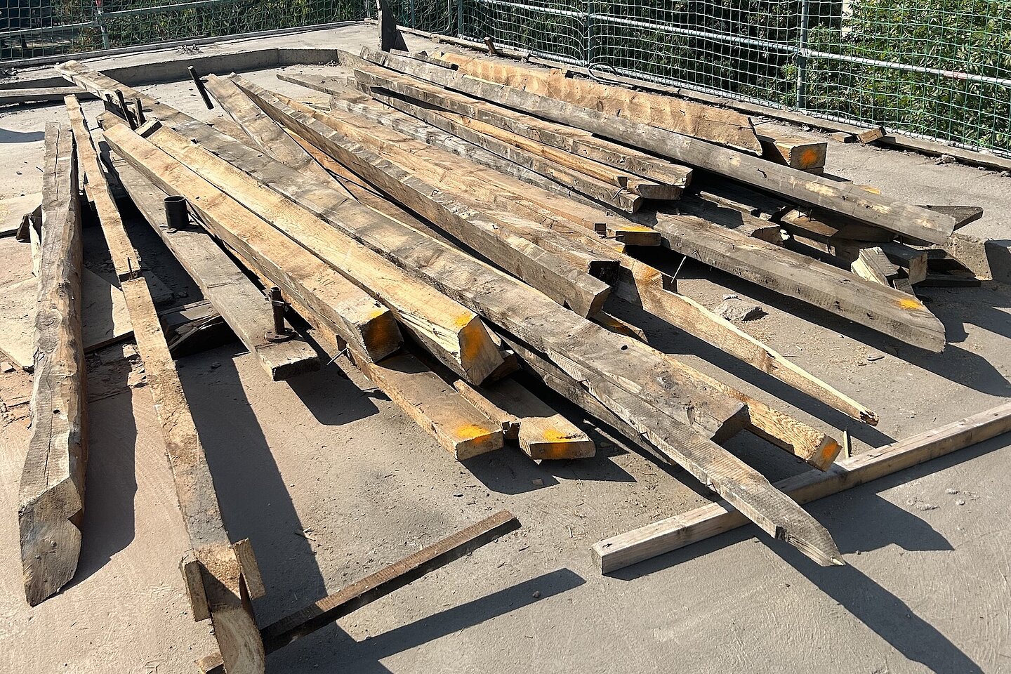 Altholzbalken eines Dachstuhl-Rückbaus © FLEX@HTWK Leipzig, Luisa Sander