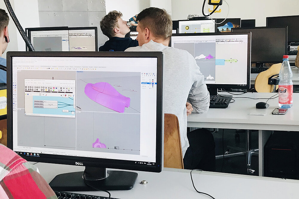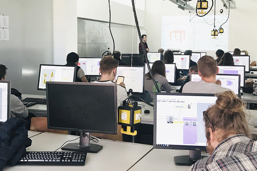 Diese zentrale Frage stellte sich Prof. Alexander Stahr und 16 Studierende des Architekturstudiengangs zu Beginn der Intensivwoche im Frühsommer 2019. Am Beispiel einer Regalwand, einer Sitzbank sowie 16 individuell gestalteter Lampen wurde innerhalb der PC-Pools und den Werkstätten der Fakultät Architektur und Sozialwissenschaften die Anwendbarkeit der Mixed- und Augmented-Reality-Brille „Microsoft HoloLens“ in Zusammenhang mit numerisch gesteuerten Fertigungsanlagen untersucht.
