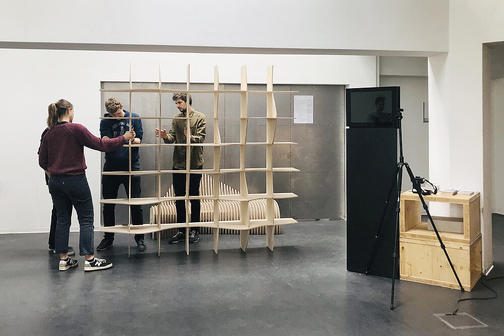 Ähnlich intuitiv lässt sich das Regal auch montieren. Ohne zusätzliche Verbindungsmittel können die einzelnen Lamellen händisch ineinander geschoben werden und steifen sich dann gegenseitig aus. Um das zu gewähreisten, müssen die Schlitze in den Lamellen groß genug sein um einen gewaltlosen Einschub zu ermöglichen, dürfen gleichzeitig aber nicht zu viel Spiel zulassen, da sich das Regal anschließend bewegen könnte.