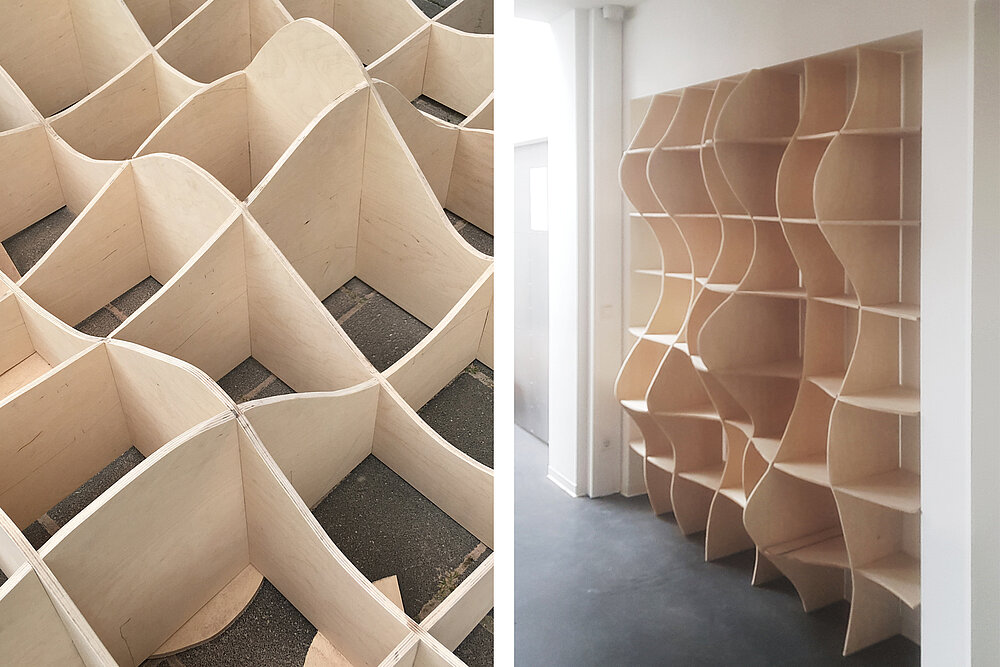 Um die am Computer generierten Freiformen der jeweils individuellen Regalböden und Regalschwerter ohne Umwege auf den Sperrholzplatten anzureißen, wurden die Konturen der Geometrie mit Hilfe einer Augmented-Reality-Brille in den Arbeitsraum projeziert und auf das Werkstück übertragen. Das macht Spaß und spart Papier!