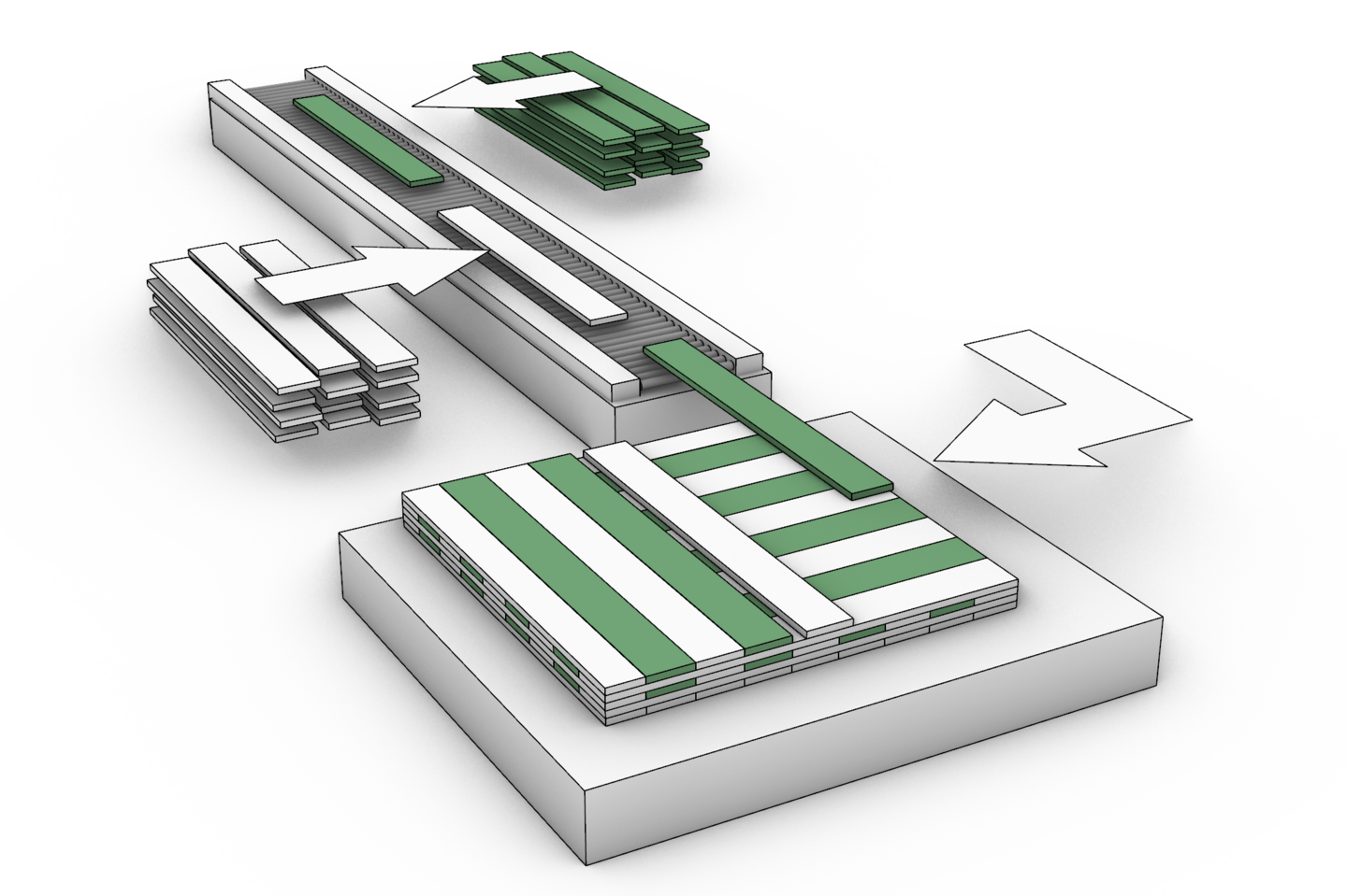Der Bausektor steht vor erheblichen ökologischen und strukturellen Herausforderungen. Hohe Treibhausgasemissionen, lange und globalisierte Lieferketten sowie der intensive Einsatz mineralischer Baustoffe tragen wesentlich zur Klimabelastung bei. Gleichzeitig wächst der Bedarf an effizient herstellbaren, flexiblen und nachhaltigen Bauweisen. Der Holzbau bietet hier großes Potenzial, insbesondere durch Brettsperrholz (BSP/CLT) als industriell vorgefertigtes, tragfähiges und vielseitig einsetzbares Bauelement. In der aktuellen Praxis ist die BSP-Produktion jedoch stark zentralisiert, technisch hoch standardisiert und nur begrenzt an regionale Rohstoffverfügbarkeiten oder projektspezifische Anforderungen anpassbar. Funktionale Eigenschaften wie Wärmeschutz, Schallschutz oder Brandschutz werden häufig durch zusätzliche Schichten und Materialien ergänzt, was den Materialeinsatz erhöht, die Komplexität steigert und ökologische Vorteile teilweise relativiert. Vor diesem Hintergrund stellt sich die Frage, wie eine ressourceneffiziente, regional verankerte und zugleich leistungsfähige Brettsperrholzproduktion zukünftig gestaltet werden kann.