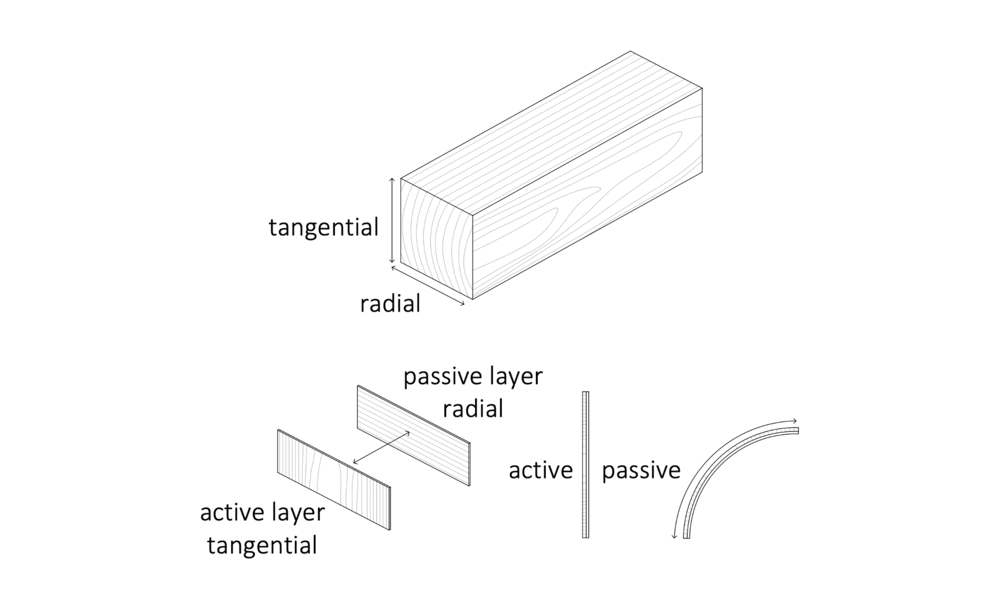 Grundlage dafür bildet ein zweilagig-anisotroper Furnierwerkstoff, bei dem modifizierte Schichten aus Laub- und Nadelholz in variierender Faserrichtung kombiniert werden.