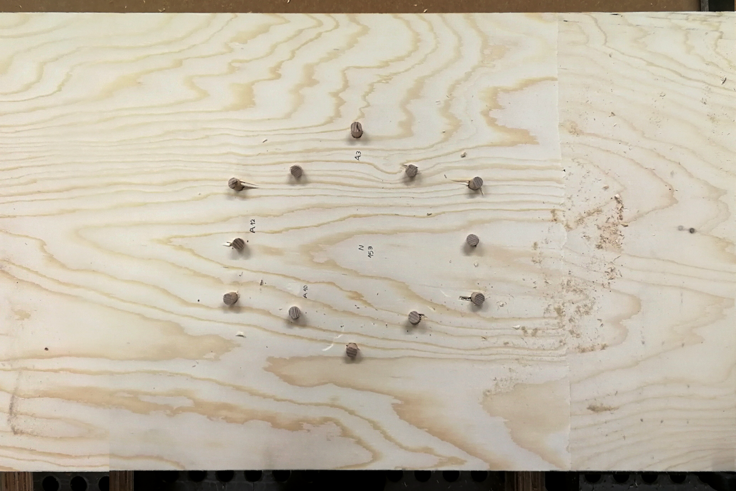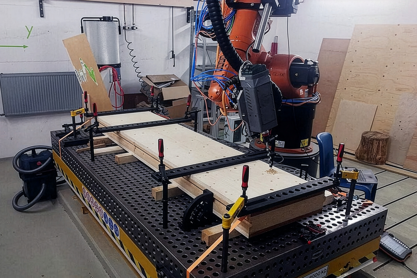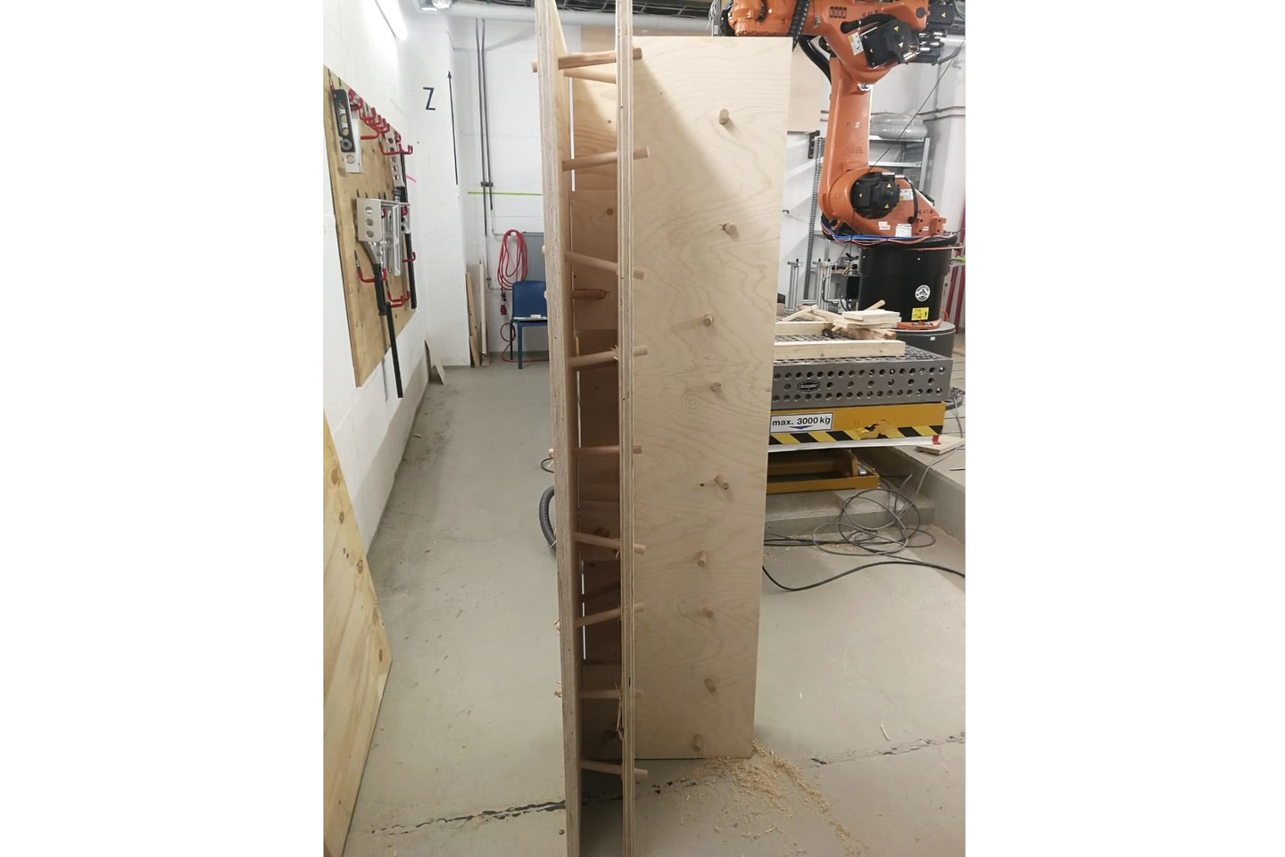 Um die Herstellbarkeit von IDS-Wänden in einem vollständig automatisierten, raumsparenden Fertigungsprozess zu validieren wurden in der IDS.Machbarkeitsstudie zahlreiche Fertigungsversuche mit einem Kuka HA60 Industrieroboter durchgeführt. Diese umfassten zunächst schräge Tieflochbohrungen, sowie das mechanische (auf Basis verdichteter Buchenholz-Nägel) und thermische Verankern (unter Ausnutzung des Quell- und Schwindverhaltens verschiedener Laubhölzer) von einzelnen Dübelverbindungen. Anschließend wurden realmaßstäbliche IDS-Wandbauteile hergestellt und dabei die Dauer der notwendigen Fertigungsschritte und Werkzeugwechsel gemessen. Die Ergebnisse der Versuche wurden in hochfrequenten, wiederkehrenden Projekttreffen mit den Praxispartnern diskutiert und auf deren baupraktische Beständigkeit überprüft.