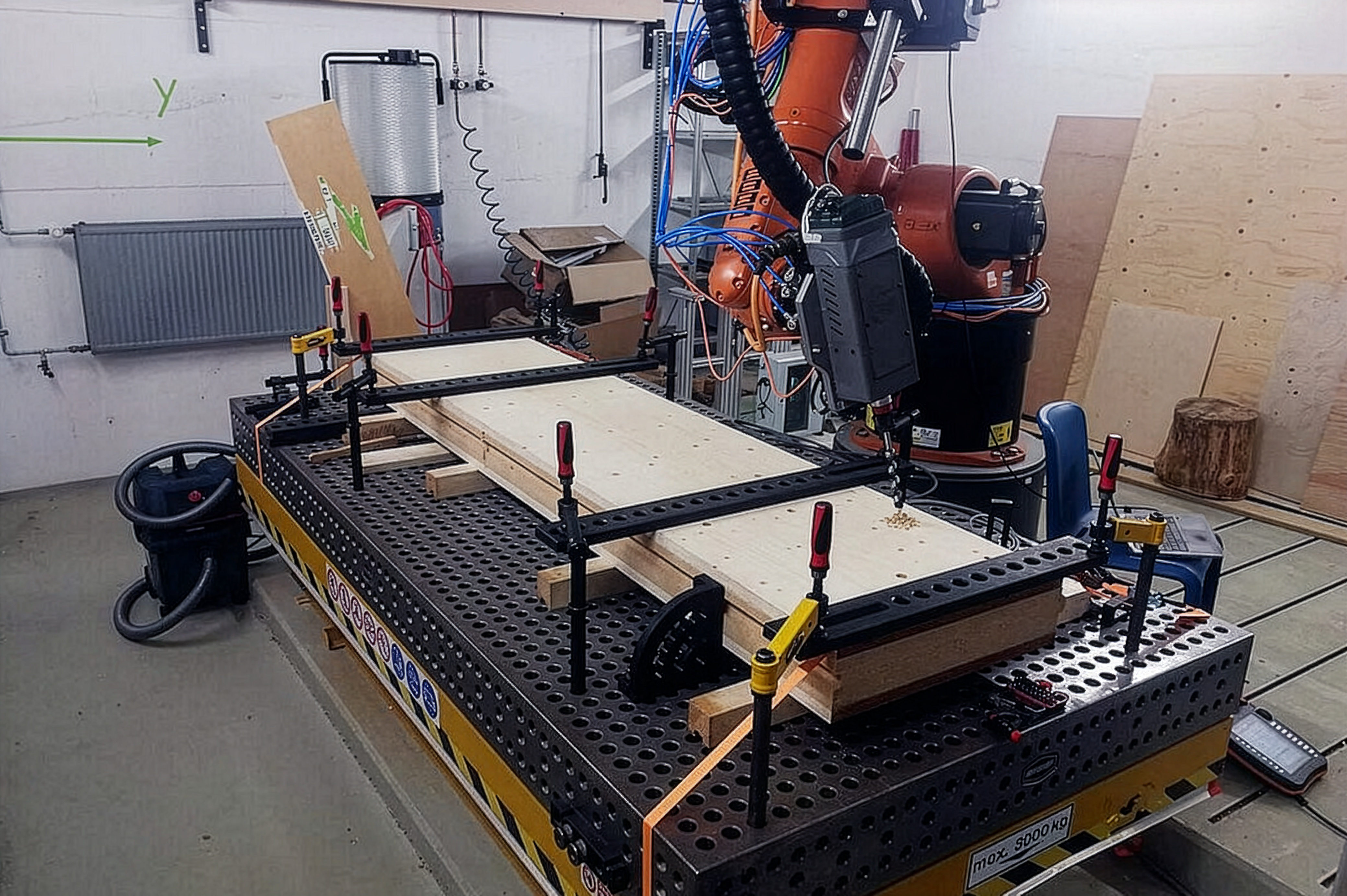 Um die Herstellbarkeit von IDS-Wänden in einem vollständig automatisierten, raumsparenden Fertigungsprozess zu validieren wurden in der IDS.Machbarkeitsstudie zahlreiche Fertigungsversuche mit einem Kuka HA60 Industrieroboter durchgeführt. Diese umfassten zunächst schräge Tieflochbohrungen, sowie das mechanische (auf Basis verdichteter Buchenholz-Nägel) und thermische Verankern (unter Ausnutzung des Quell- und Schwindverhaltens verschiedener Laubhölzer) von einzelnen Dübelverbindungen. Anschließend wurden realmaßstäbliche IDS-Wandbauteile hergestellt und dabei die Dauer der notwendigen Fertigungsschritte und Werkzeugwechsel gemessen. Die Ergebnisse der Versuche wurden in hochfrequenten, wiederkehrenden Projekttreffen mit den Praxispartnern diskutiert und auf deren baupraktische Beständigkeit überprüft.