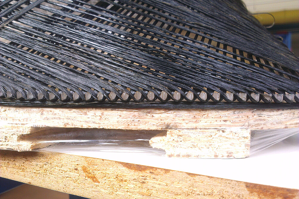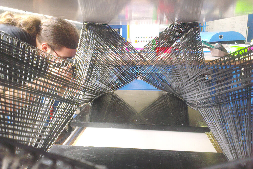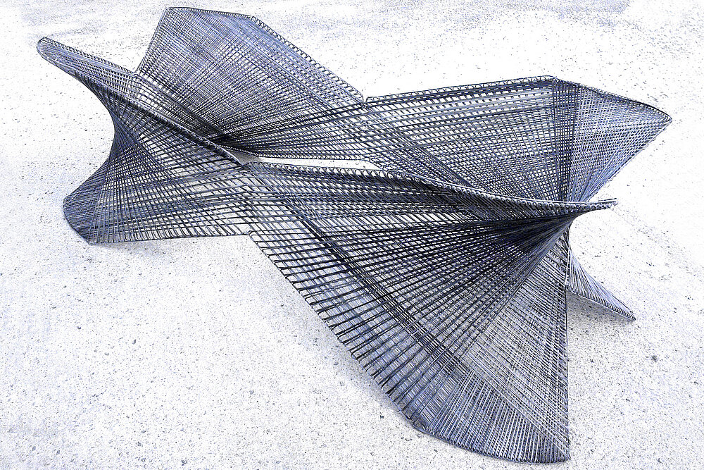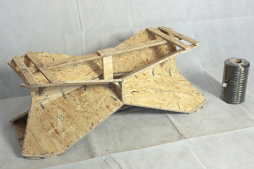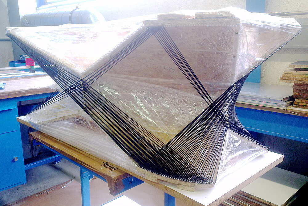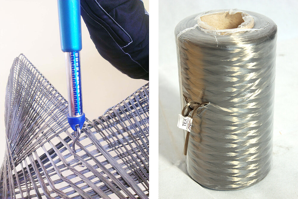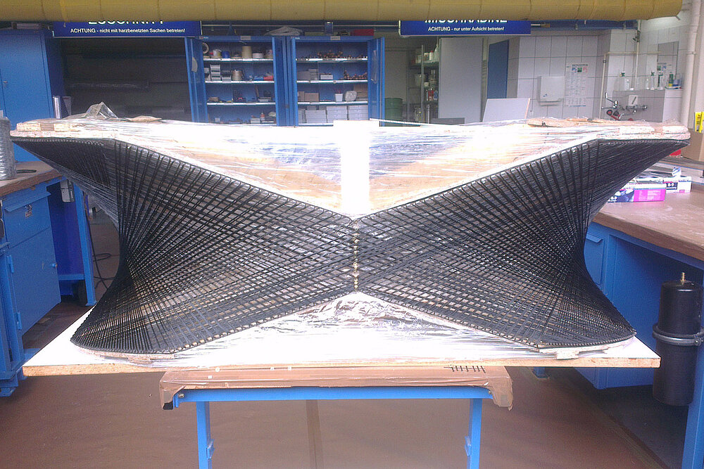 Die primär zugfesten Basaltfasern werden zunächst durch ein flüssiges Spezial-Kunststoff-Bad gezogen und anschließend zwischen je zwei „Kämmen“ gespannt, die entlang der geraden Kanten einer formgebenden Hilfskonstruktion befestigt sind. Im Ergebnis bilden sie eine diskontinuierliche, räumlich gekrümmte Gitterstruktur ab. Das Kunststoffharz härtet aus, das heißt es verfestigt sich unter Lufteinwirkung und fixiert die Fasern somit dauerhaft. Nach dem Entfernen der Hilfskonstruktion ist die Gesamtstruktur tragfähig. Das Gewicht des auf den Fotos dargestellten Prototypen beträgt zirka 1,4 kg.