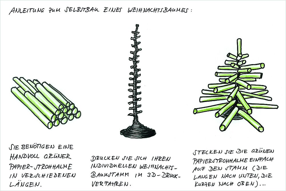 Das Projekt ist das Resultat eines internen Wettbewerbs im FLEX.team um die Gestaltung der Weihnachtskarte für 2017. Die Idee der "Anleitung zum Selbstbau eines Weihnachtsbaumes" von Malika Eilers setze sich dabei in einem teaminternen Voting durch. In starker konzeptioneller Anlehnung an das vor Kurzem umgesetzte Projekt ParaKnot3D fokussiert der in skizzenhaftem Zeichenstil entwickelte Entwurf Schritt für Schritt auf die Herstellung eines zerlegbaren Weihnachtsbaum-Modelles aus einem 3D-gedruckten Baumstamm und Ästen aus aufgesteckten grünen Papierstrohhalmen.