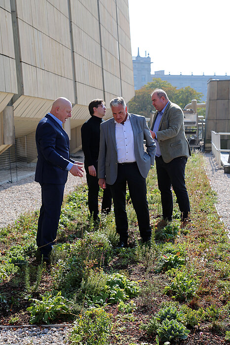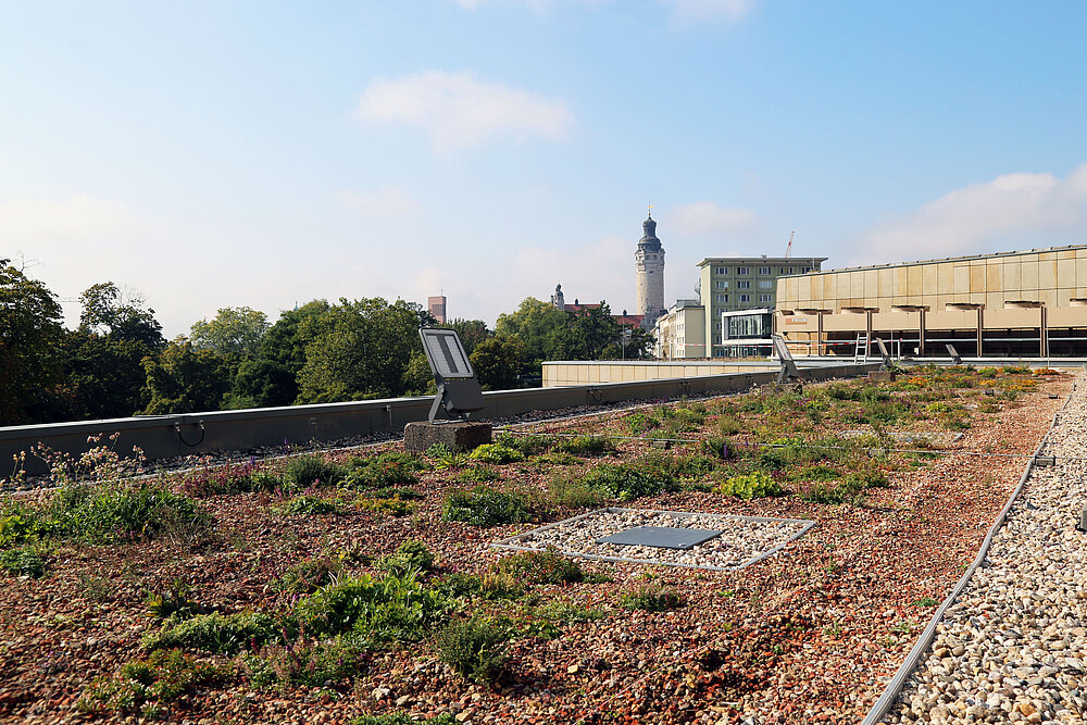 Das Gewandhaus zu Leipzig ersetzt die Kiesflächen auf seinem Flachdach teilweise durch Dachbegrünung, um einen Beitrag für eine klimaresilientere Stadt zu leisten. Damit die Pflanzen in einem guten Zustand bleiben, sind vielfältige Maßnahmen erforderlich. Um diese zu erproben und Erkenntnisse über das Management von Gründächern zu gewinnen, arbeitet das Gewandhaus eng mit Forschungseinrichtungen zusammen. Dazu gehören Forschende der HTWK Leipzig, des Forschungs- und Transferzentrums Leipzig (FTZ) und des Helmholtz-Zentrums für Umweltforschung (UFZ) in Leipzig.