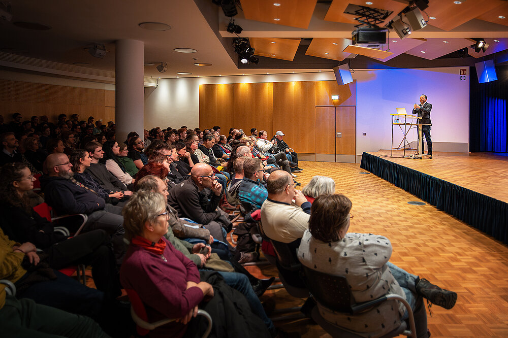 Beim Wissenschaftskino am 10. Dezember 2024 im Zeitgeschichtlichen Forum in Leipzig zeigte Reuther den rund 180 anwesenden kleinen und großen Besucherinnen und Besuchern noch drei weitere Actionszenen aus James-Bond-Filmen und analysierte gemeinsam mit dem Publikum die Physik dahinter. „Ich möchte vor allem jungen Menschen zeigen, dass Physik weder schwer noch unverständlich ist“, so Reuther.